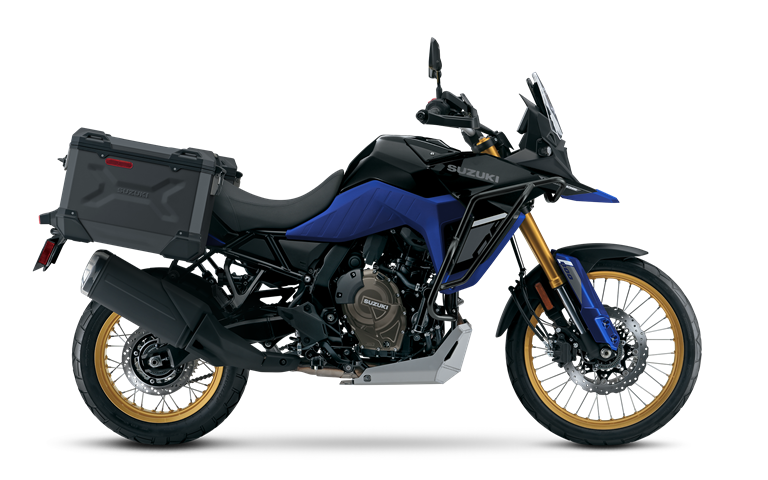 Included are Suzuki’s ADV-style, 37-liter aluminum panniers that attach to powder-coated, stainless-steel carriers.