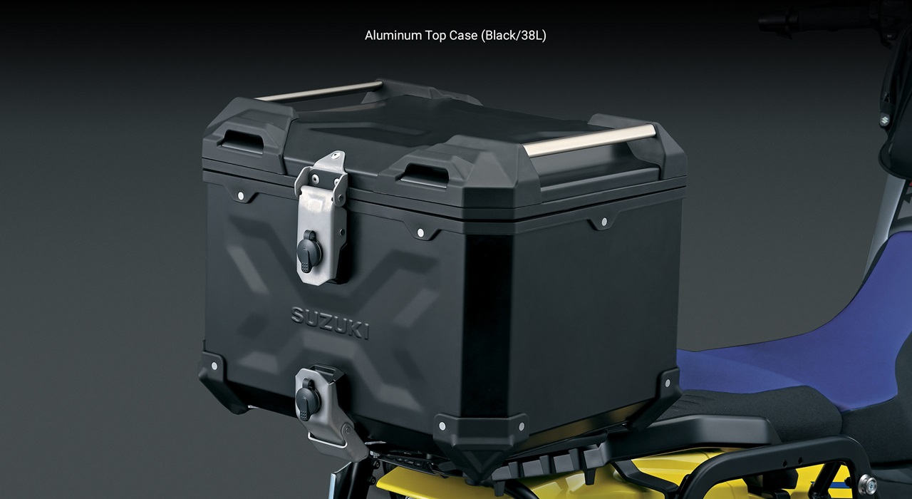 - Suzuki’s rugged accessory plastic side and top cases include locks that can be set by your Suzuki dealer to match the bike’s ignition key for true, one key operation.