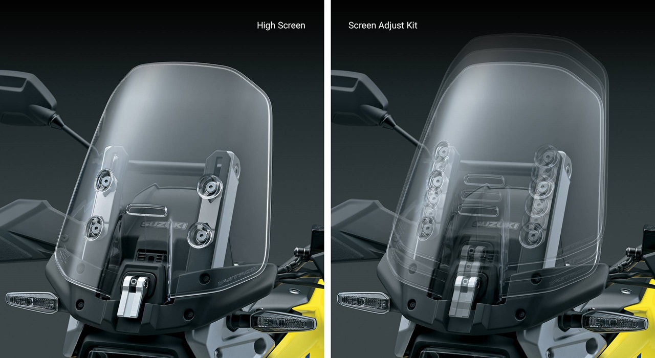 - The height of the windscreen is adjustable using basic hand tools. Suzuki accessory kits to add a higher windscreen or quick-release height adjustment are available.