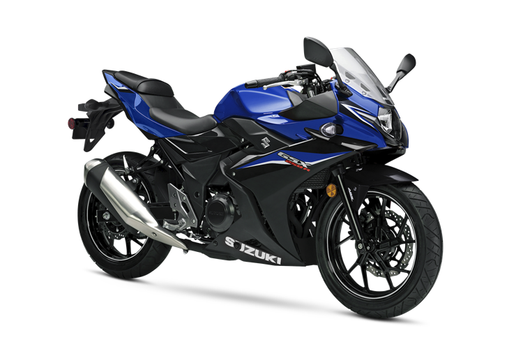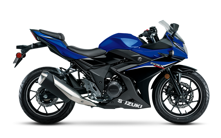 Here’s a fully faired, quarter-liter sportbike with aggressive, flowing styling true to the Suzuki sportbike heritage. The GSX250R ABS’s new, two-tone Metallic Crystal Blue and Pearl Nebular Black paint scheme brings big bike quality to the 250 class.