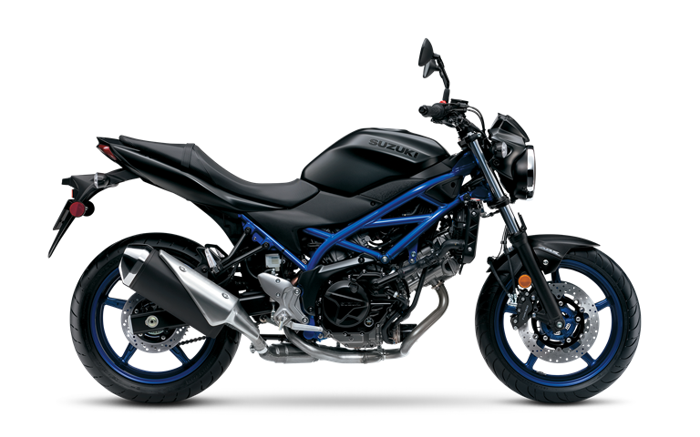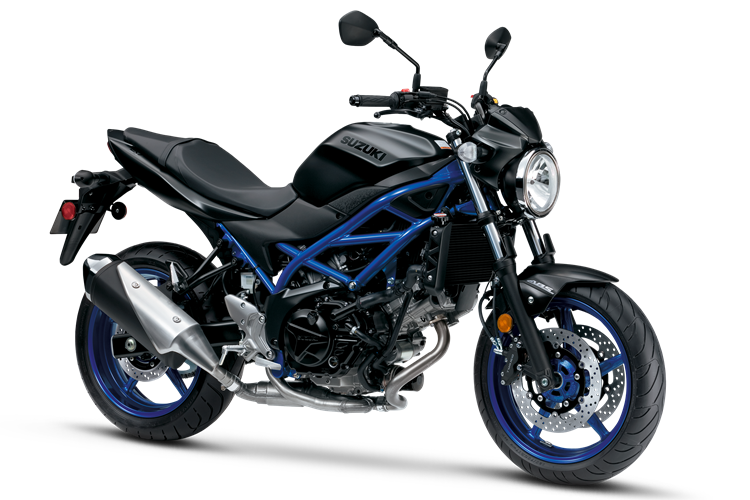 The 2022 SV650 ABS’s Metallic Matte Black No. 2 bodywork is accompanied by a frame and wheels coated with blue metallic paint.