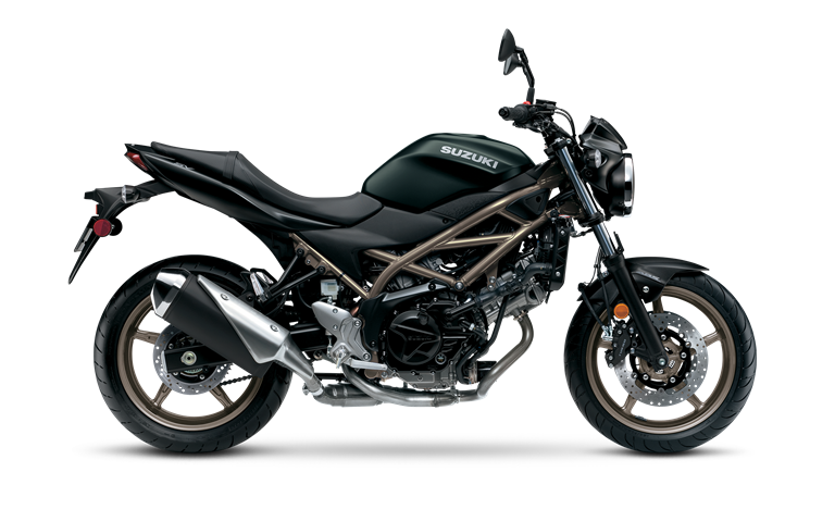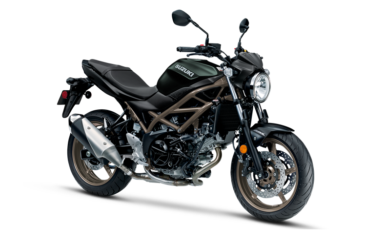 The 2025 SV650 ABS’s trim and aesthetically pleasing Pearl Matte Shadow Green / Metallic Matte Black No.2 bodywork is mounted to a visually stunning, dark gold trellis-style frame.