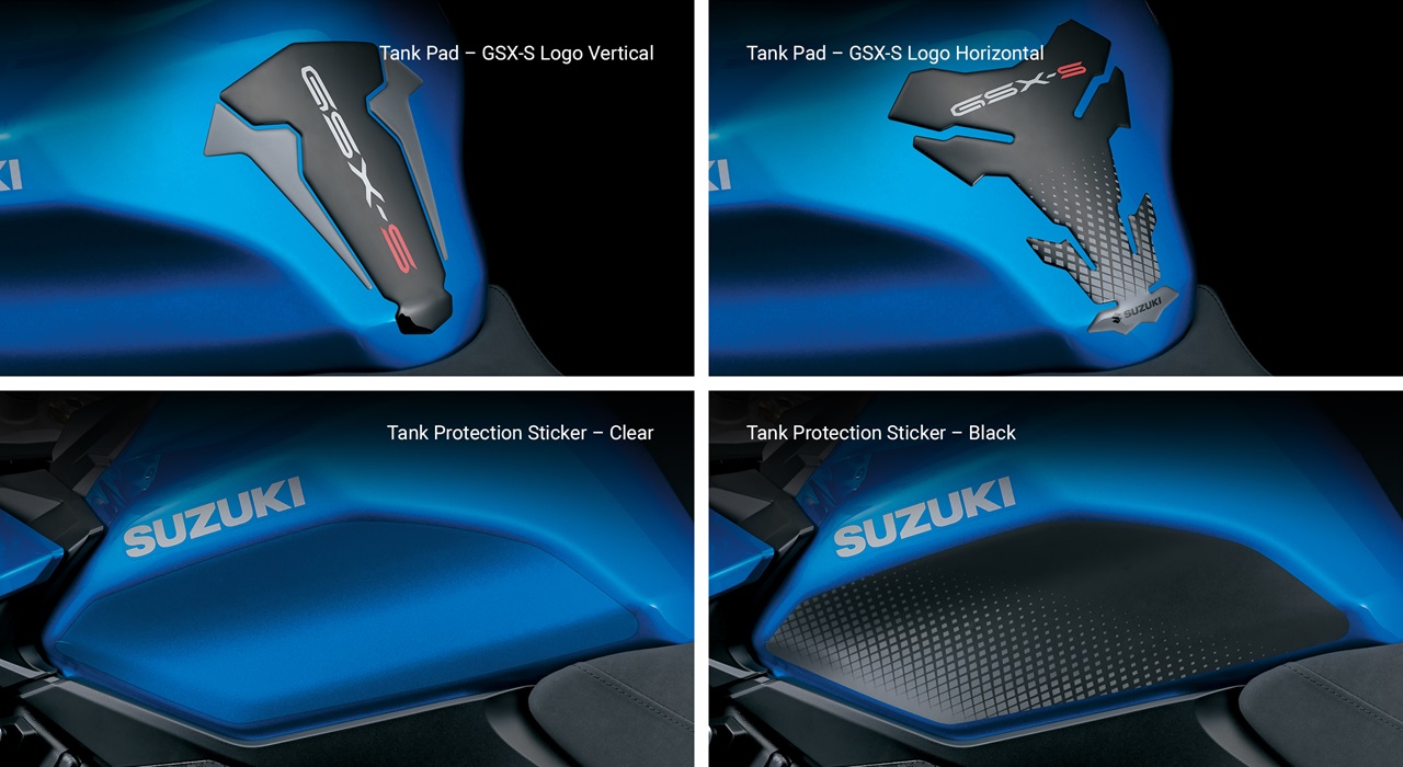 A variety of Genuine Suzuki Accessories are available, such as a solo seat cowl, meter visor (acts as a sport screen), billet clutch and brake levers, fuel tank and engine cover protectors, clip-on tank bags, plus a selection of GSX-S logo apparel.
