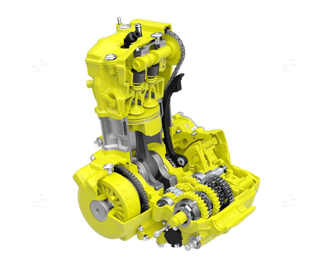 Fully revised 398cc single-cylinder four-valve DOHC engine delivers a smooth, controllable spread of torque from low RPM up through peak power. New higher-lift camshafts with reduced overlap press upon new titanium intake valves.