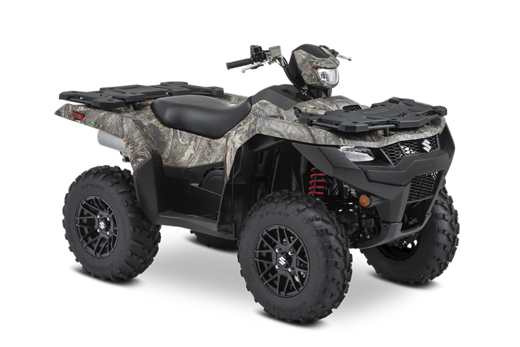 High traction 25-inch Carlisle® tires on lightweight, cast aluminum wheels have a special blacked-out finish. Suzuki's plush T-shaped seat delivers rider mobility during spirited or difficult terrain riding.